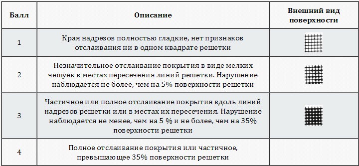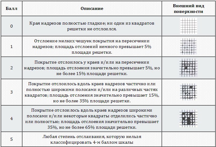 | Баллы определения и оценки адгезии | 1-4 (по ГОСТ 15140 метод решетчатых надрезов) 1-3 (по ГОСТ 15140 метод параллельных надрезов) 0-5 (по ISO 2409, ISO 16276-2, ASTM D3359) |