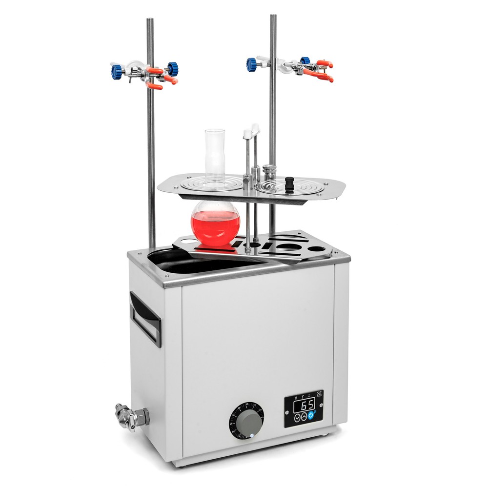 Универсальная баня ЛБ23‑Ш оснащена легко извлекаемой корзиной с подвижным дном для размещения лабораторной посуды различного размера, стальными концентрическими кольцами для ее уплотнения, штативами и лапками с зажимом.
