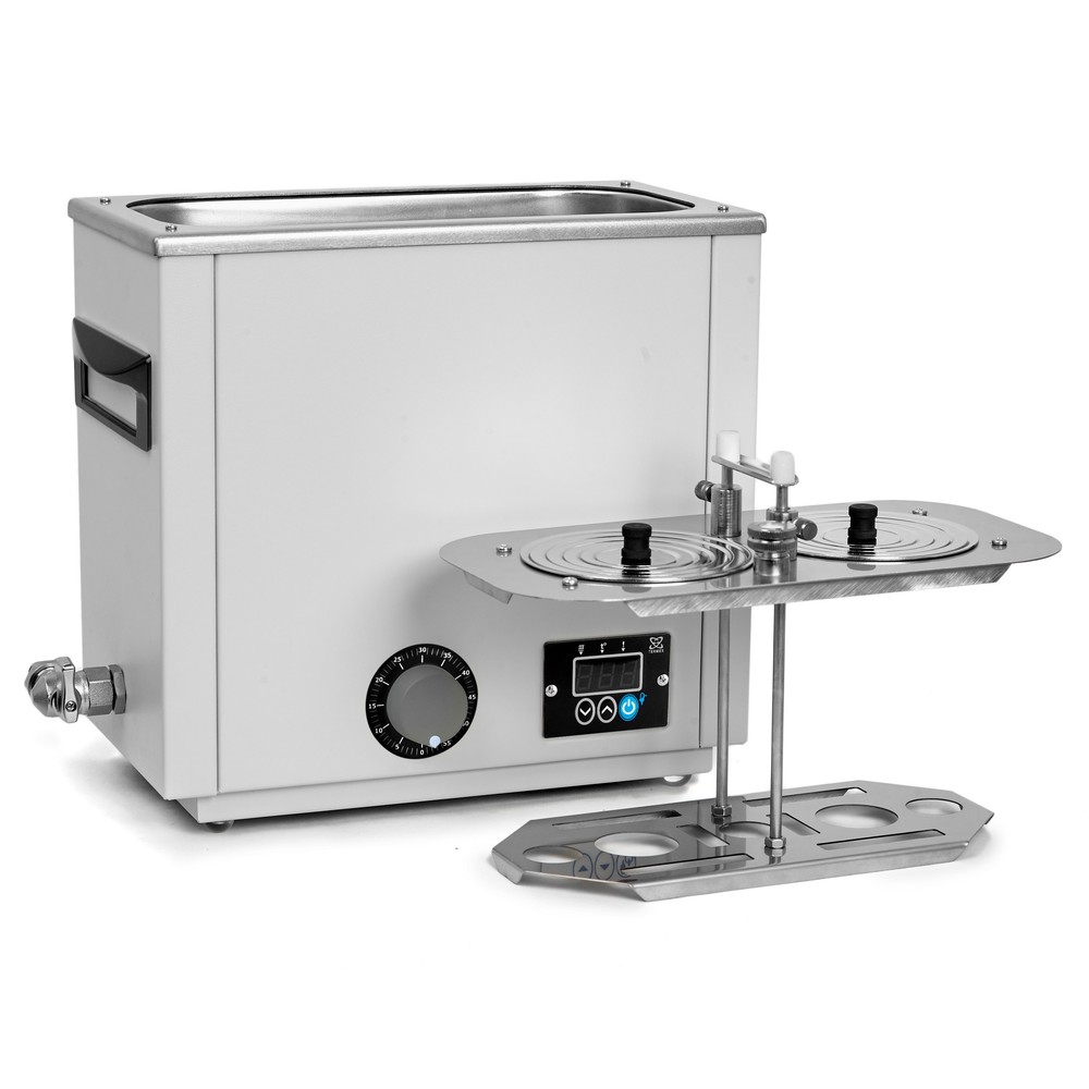 - Система из 5‑ти стальных концентрических колец позволяет уплотнять размещенные в ванне колбы, стаканы и другую лабораторную посуду.