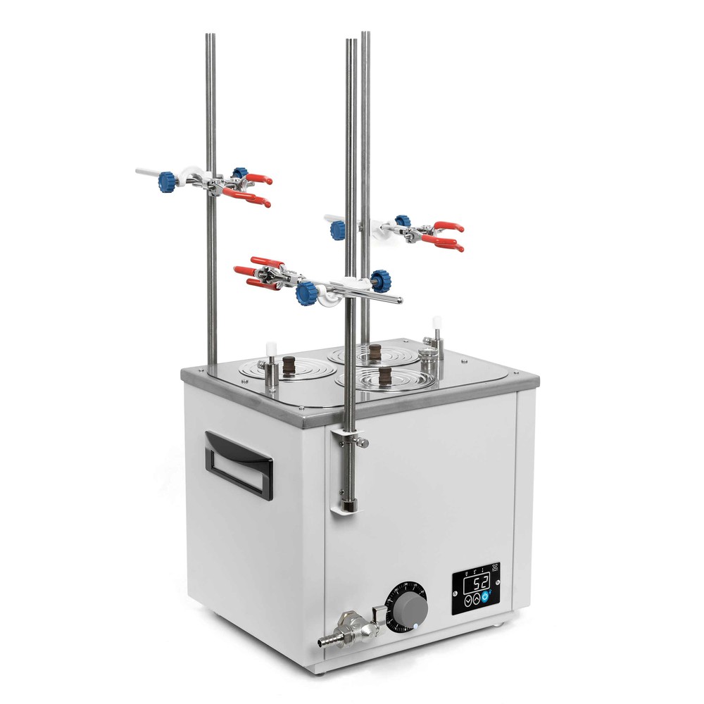 Универсальная баня ЛБ33‑Ш оснащена легко извлекаемой корзиной с подвижным дном для размещения лабораторной посуды различного размера, стальными концентрическими кольцами для ее уплотнения, штативами и лапками с зажимом.