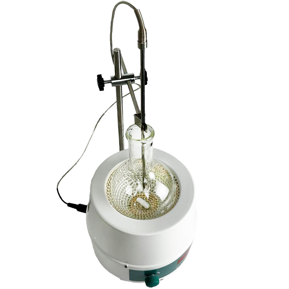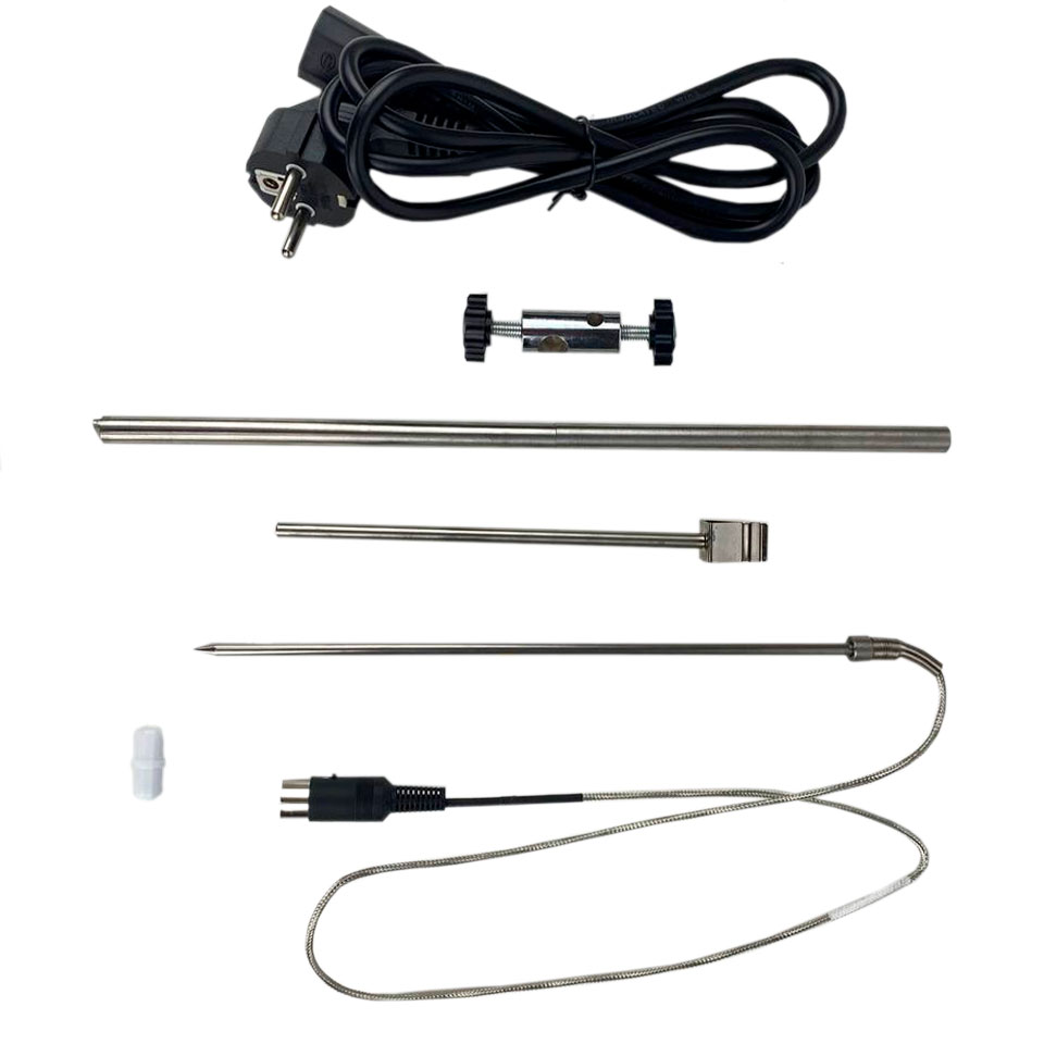 В комплект входят магнитный перемешивающий элемент, кабель питания, термодатчик PT100, позволяющий точно контролировать температуру образца при нагреве, и комплект креплений для него: штанга, зажим и опорный стержень.