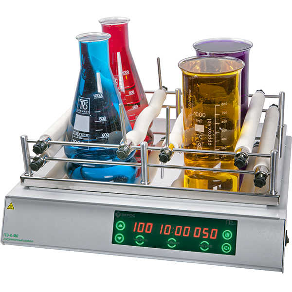 Шейкер лабораторный ЭКРОС-6410 (ПЭ-6410) предназначен для одновременного пеpемешивания в горизонтальной плоскости жидкостей в нескольких сосудах объемом от 100 до 1000 мл с возможностью подогpева.