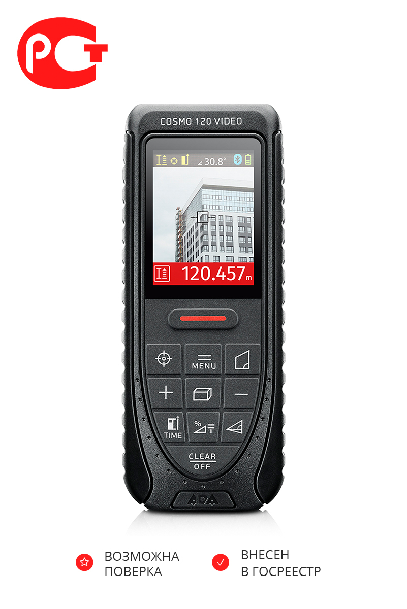Лазерная рулетка ADA COSMO 120 Video новинка 2017 года на рынке профессиональных лазерных рулеток. Уникальное сочетание цифрового визира и 360° датчика наклона позволяет проводить измерения, которые не возможно выполнить с обычными лазерными дальномерами.