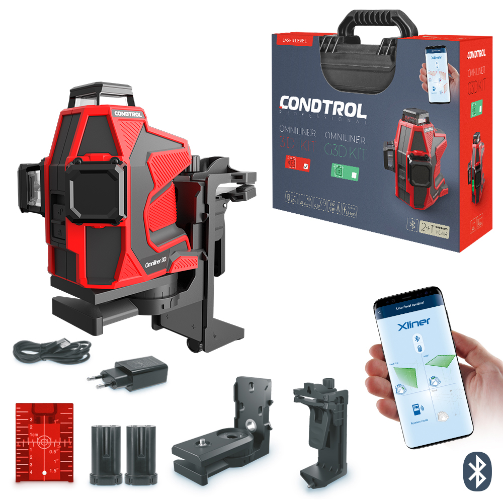 CONDTROL Omniliner G3D Kit — то профессиональный расширенный комплект, включающий в себя лазерный нивелир Omniliner G3D, настенное крепление, крепление-зажим, магнитную мишень, аккумулятор 2шт., кабель для зарядки, руководство по эксплуатации и надежный пластиковый кейс.