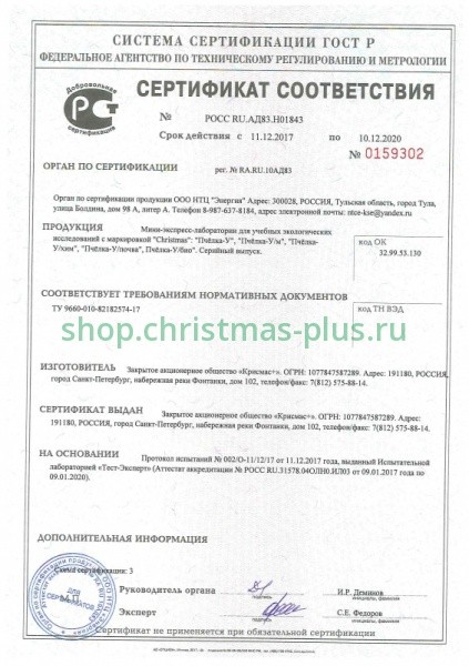 Мини-экспресс-лаборатория «Пчёлка-У» имеет сертификат соответствия требованиям действующих нормативных документов № РОСС RU.АД83.Н01843 № 0159302.