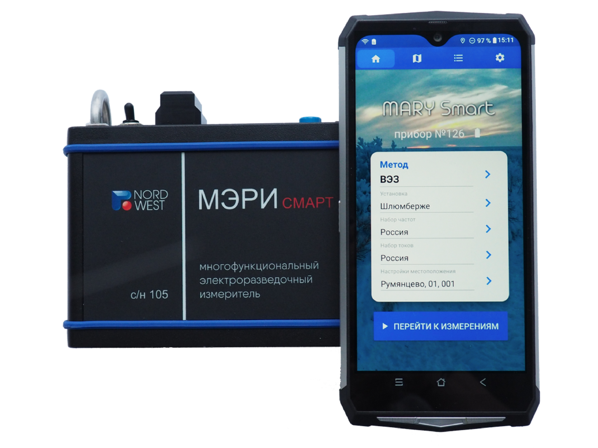МЭРИ Смарт – это одноканальный электроразведочный измеритель с 24-битным АЦП, низкими собственными шумами (<1 мкВ), управляемый с помощью смартфона.
