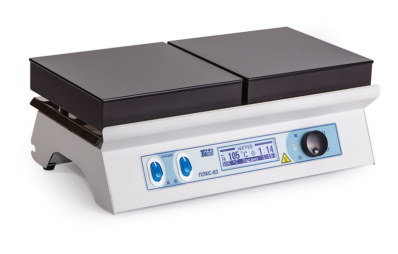 Плита нагревательная лабораторная секционная ПЛКС-03 имеет две секции нагрева. Каждая секция нагрева может работать отдельно или совместно. При совместной работе секций температура разогрева одинакова по всей нагревательной поверхности обеих секций.