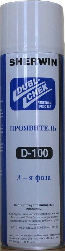 D-100 – универсальный, спиртовой проявитель белого цвета, использующийся для выявления следов пенетранта при средних температурах. Помимо контроля изделий из металла, проявитель D-100 может быть использован для дефектоскопии пластика, керамики и других полимеров. Обязательным условием применения, является распыление проявителя только при помощи аэрозольного баллона или специального пульверизатора. При использовании проявителя D-100 при низкой температуре, длительность высыхания увеличивается.