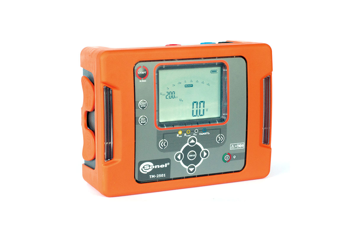 TM-2501 — цифровой мегаомметр, предназначенный для измерения сопротивления изоляции кабельных линий, проводов, обмоток трансформаторов, двигателей, других электро- и телекоммуникационных установок. Максимальное измерительное напряжение составляет 2500 В постоянного тока, а диапазон измеряемого сопротивления ограничен величиной в 1000 ГОм. Установка трех интервалов времени позволяет автоматически рассчитывать коэффициенты абсорбции (увлажненности) и поляризации (старения). В процессе измерения сопротивления изоляции прибор отображает величину тока утечки.