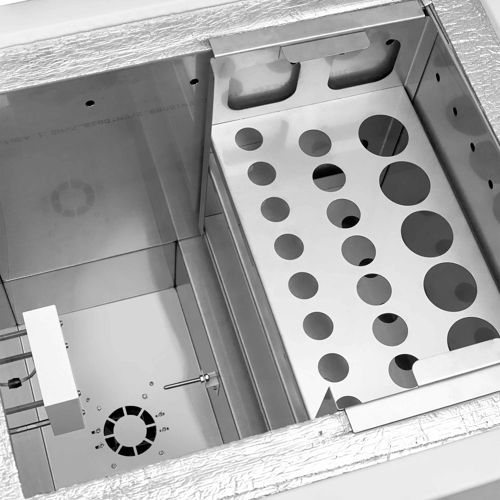 Камера объемом 80 литров с корзиной для размещения лабораторной посуды с пробами.