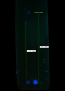 На фото — скрин с экрана компьютера. В камере — стеклянная пластина с сорбентом , визуализация хроматограммы с помощью БФЛ-5-1, при облучении ее с длиной волны 254 нм. Изображение получено с блока документирования БФЛ 5-1 с разрешающей способностью 5 Мп. Поставляется с программой, позволяющей захватывать изображение, сохранять, обрабатывать его. Также программа позволяет измерять размеры и взаимное расстояние между объектами. Например, дистанцию от линии фронта растворителя до пятна, от линии старта , и т.д. Путем несложных вычислений, таким образом, пользователь получает величины Rf для различных образцов.