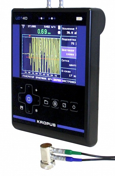 Ультразвуковой толщиномер УДТ-40 — это универсальный прецизионный толщиномер с высокой точностью и достоверностью контроля. Наличие А-скана исключает такие типичные ошибки при измерении толщины, как удвоение показаний, а В-скан позволяет наблюдать профиль дна изделия. Толщиномер реализует различные высокоточные способы контроля толщины – измерение времени по переходу через «ноль», измерение времени между сигналами, измерение толщины металла под покрытиями, ЭМА-контроль и т.д. Наличие встроенных контуров согласования, регулируемой ширины импульса и трех степеней электрического демпфирования позволяет использовать для измерения толщиномером любые преобразователи с частотами от 0,5 до 15 МГц, как совмещенного, так и раздельно-совмещенного (раздельного) типа.