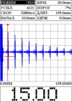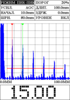 Помимо определения толщины изделия, прибор можно использовать в качестве ультразвукового дефектоскопа, так как на А- развертке возможно отображение сигналов от внутренних дефектов. А функция В-скана позволяет визуализировать профиль контролируемого изделия при сканировании датчиком по поверхности.