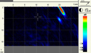 Двумерная система пространственной регулировки чувствительности (ПРЧ) позволяет вести поиск и оценку малых дефектов по существующим нормативным документам, а также корректно оценивать размеры дефектов по всей контролируемой толщине объекта контроля.- Контроль в системе трехуровневой оценки величины отражателя: «поиск-контроль-брак» с цветовой градацией уровней образов томограммы и автоматическим сравнением их с опорным уровнем.