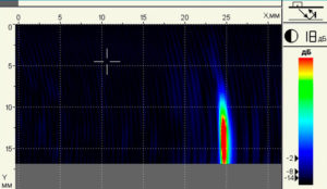 - Возможность проведения ультразвукового контроля вдоль линии сварного шва без поперечного сканирования, за счет большого размера апертуры антенных решеток и сканирования виртуальным фокусом на дальние расстояния, что существенно сокращает время на подготовку околошовной поверхности сварных соединений, повышая высокопроизводительность контроля.
