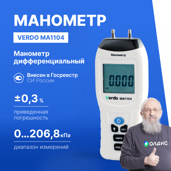 Verdo МА1104 представляет собой компактный и лёгкий дифференциальный манометр, предназначенный для точного измерения разницы давлений между двумя точками в воздушных и газовых системах.