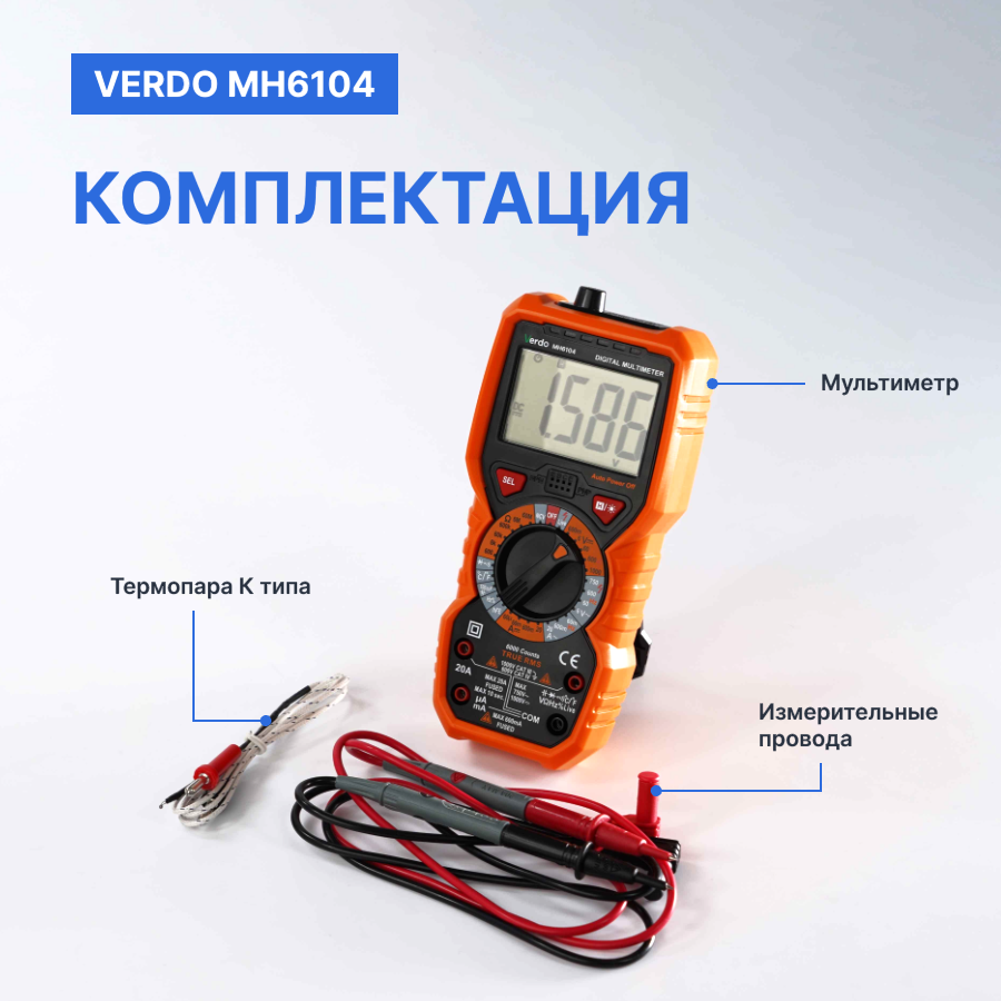 Мультиметр VERDO MH6104 – это ручной цифровой мультиметр с функцией отображения истинного среднеквадратичного значения (TrueRMS) и большим жидкокристаллическим дисплеем с подсветкой, и фонарем, что облегчает считывание показаний. Мультиметр оснащен функцией защиты от перегрузки и индикатором разряженной батареи. Этот многофункциональный измерительный прибор идеально подходит как для профессионального использования на производстве, ремонта и сервисного обслуживания, так и для обучения и бытового применения.