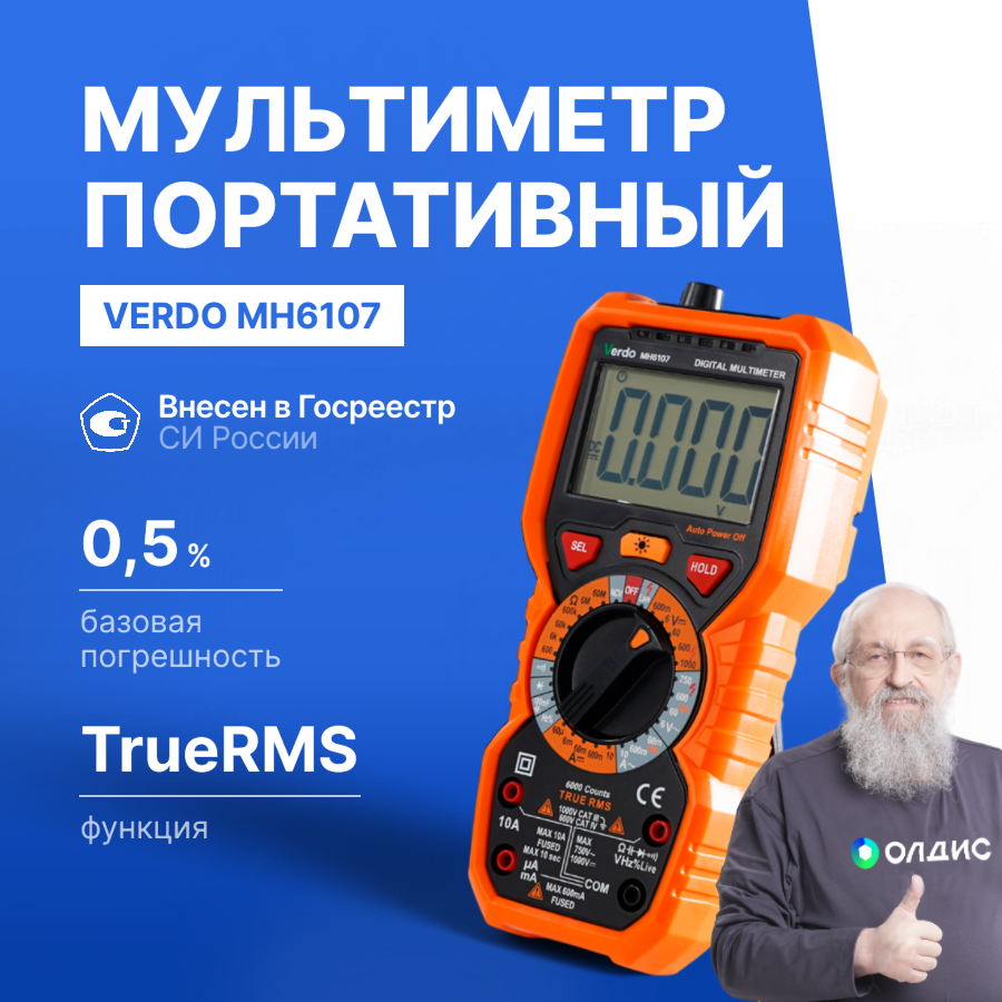 Мультиметр VERDO MH6107– это ручной цифровой мультиметр с функцией отображения истинного среднеквадратичного значения (TrueRMS) и большим жидкокри-сталлическим дисплеем с подсветкой и фонарем, что облегчает считывание показаний. Мультиметр оснащен функцией защиты от перегрузки и индикатором разряженной батареи. Этот многофункциональный измерительный прибор идеально подходит как для профессионального использования на производстве, ремонта и сервисного обслуживания, так и для обучения и бытового применения.